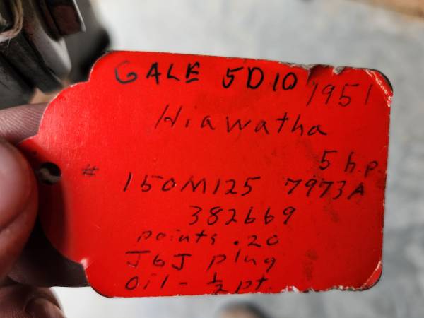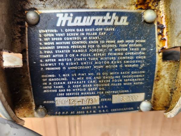 I have a good 1951 Hiawatha 5 Horse Power Outboard Motor available. I inherited this baby so haven't messed with starting her up but she seems good to go with a little fresh gasoline and tinkering with her. (Stand not included) I've priced her to sell, contact Mark via email, text or phone at: show contact info