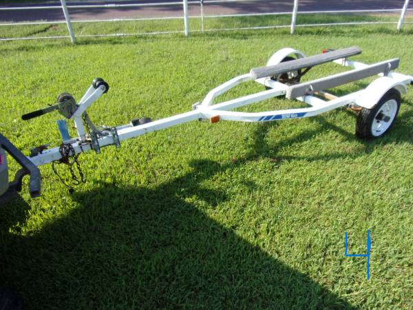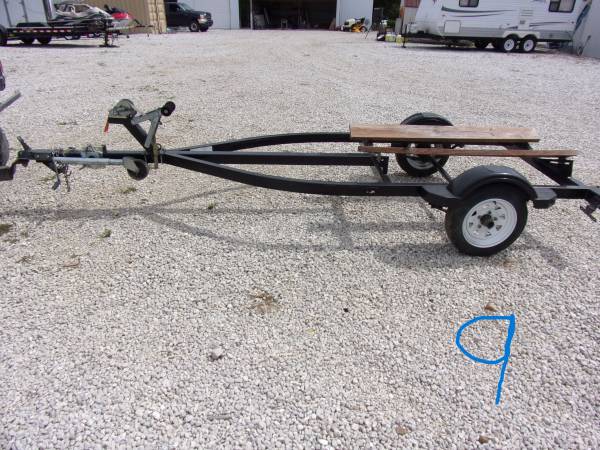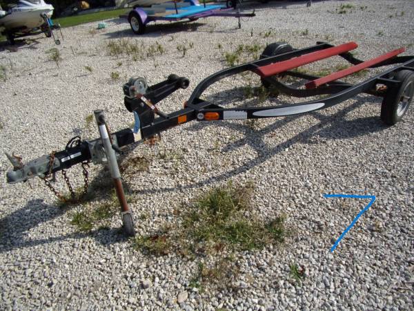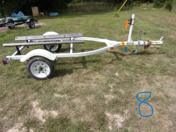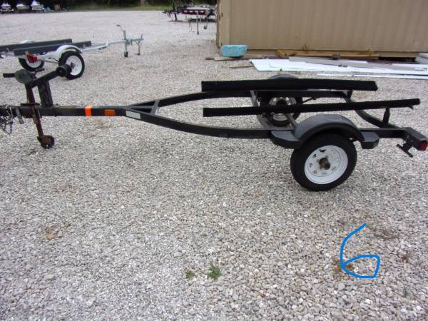 #5 i think is a Yacht Club brand- Good bearings, good winch & strap, lights work, tires good, has bearing buddies. 5 lug 480-12 tires. Total length is 153" and is about 111" to stopper. 4' wide frame and 64" outside fenders. ***NT*** for $650