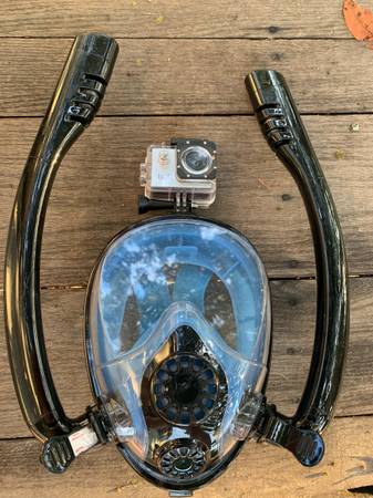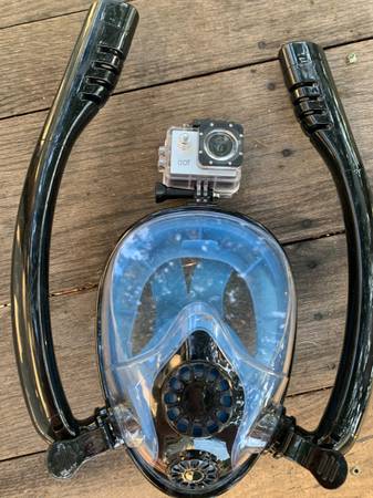 snorkel mask, full face mask, iJoy camera, action camera, waterproof camera, lake gear, diving mask, underwater camera, lake of the ozarks, adventure gear, weekend gear, local pickup, Lebanon MO, outdoor accessories, snorkel set, GoPro alternative, water sports, lake ready, summer gear, dual breathing tubes, panoramic mask