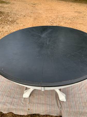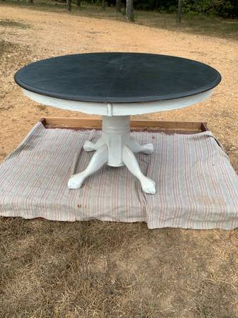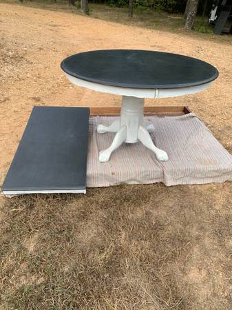 Solid wood round table with a slate-style surface and a 24" drop leaf—great for dining, crafting, or flexible workspace setups.