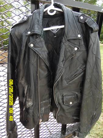 Vintage Black leather motorcycle jacket with zipper and button details. Has a liner and is in rugged good shape. It is pretty heavy though.