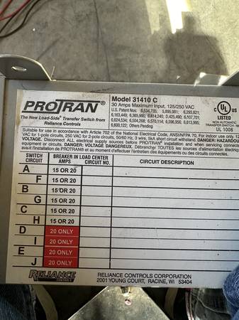 Reliance Protran model 31410C generator switchover panel with generator plugin; $50.00 CALL: