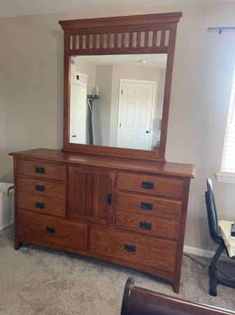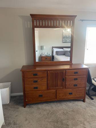 8 drawer chest of drawers with large mirror. Solid wood construction no particle board used. light walnut stain. There is 6 drawers that are independent of the others and two in the center that is behind a door, Most of the drawer slide assemblies have been replaced. We are only the second owners. Very clean and nice chest of drawers. Also available but not priced are two night stands, also in great shape. Night stands would sell for $30.00 each if wanted.