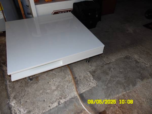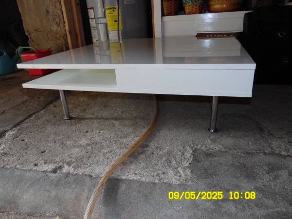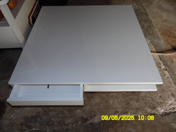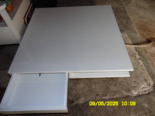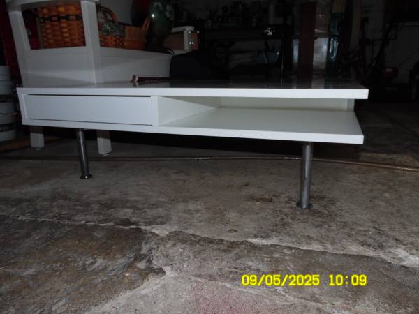 Sleek design with metal legs, 2 drawers and 2 storage shelves. Very solid made. (believe it or not) And quite heavy. 12" in height. No scratches. Looks beautiful