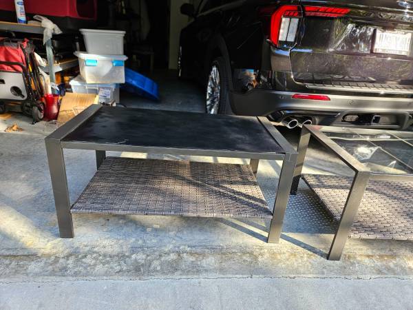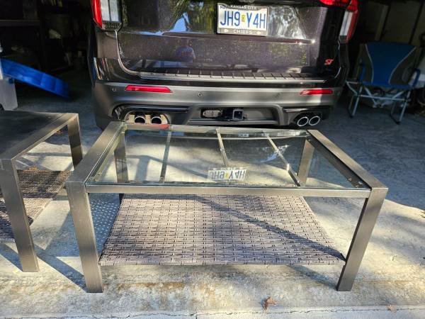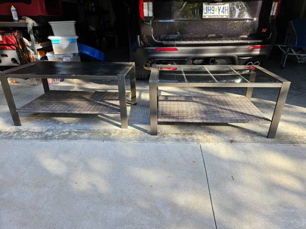 2 outdoor coffee tables Metal one has a glass top the other has plexiglass top. Good condition