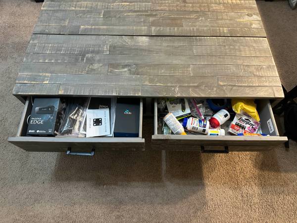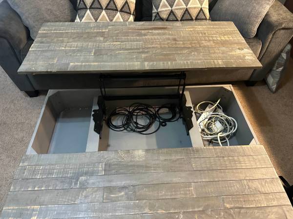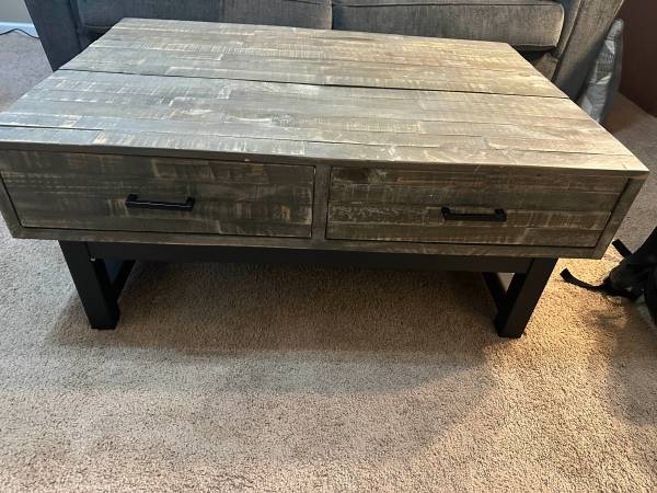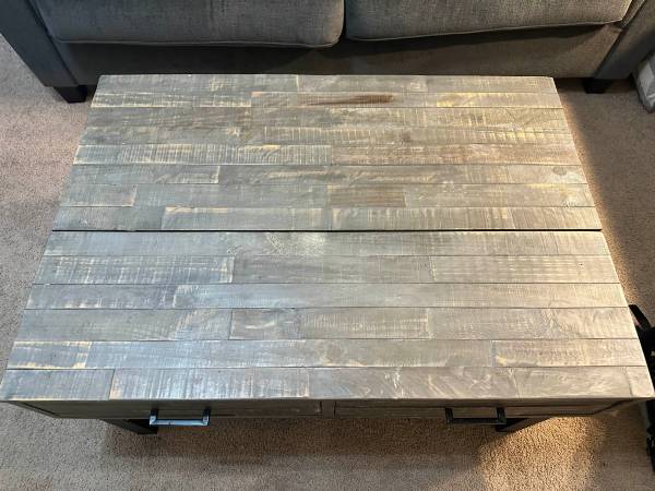 Wooden coffee table that has 2 drawers for storage and a liftable section used as a table top plus storage beneath. About 4 years old and is clean and lightly used.