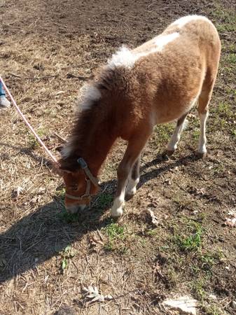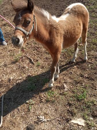 Handsome miniature stud colt weanling looking for new home with other mini horses or mini donkeys. He has been dewormed, is halter broke and is doing good with leading. Beautiful little guy. Calm temperament. His mom is a black/white paint and dad is a bay. Should be possibly around 34-38 inches tall when full grown. Born June 21, 2025. $800 cash