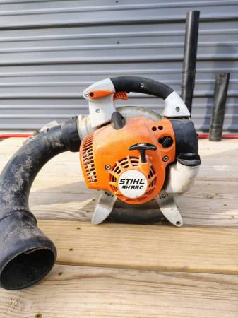 SH86 Shredder blower. Comes with all tubes for general and wet condition blowing and suction attachments for leaf shredding. Leaf bag has a broken clasp and has a new carburetor. Repair certified by gold certified service technician that will also handle communications and sale.