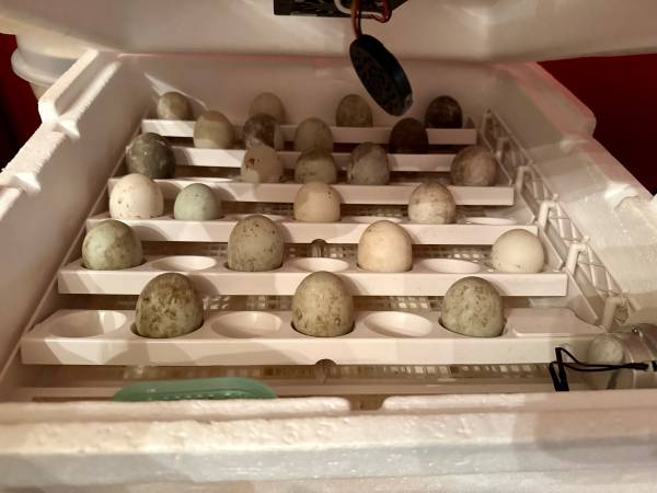 Duck and chicken eggs for eating or hatching from free-range, cage-free birds that are also fed treats.