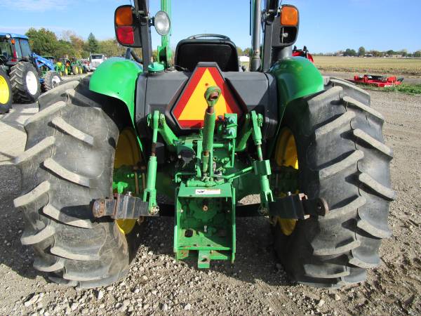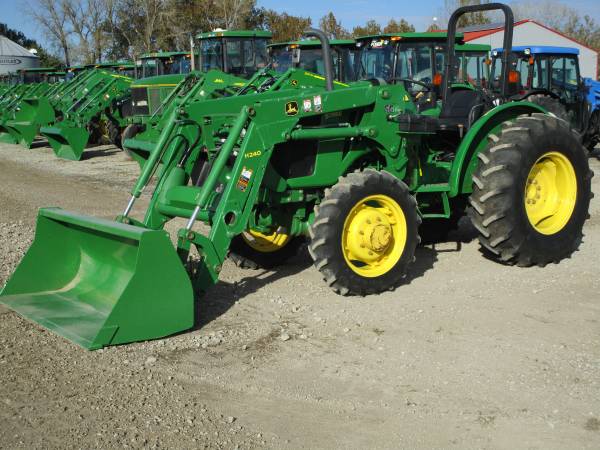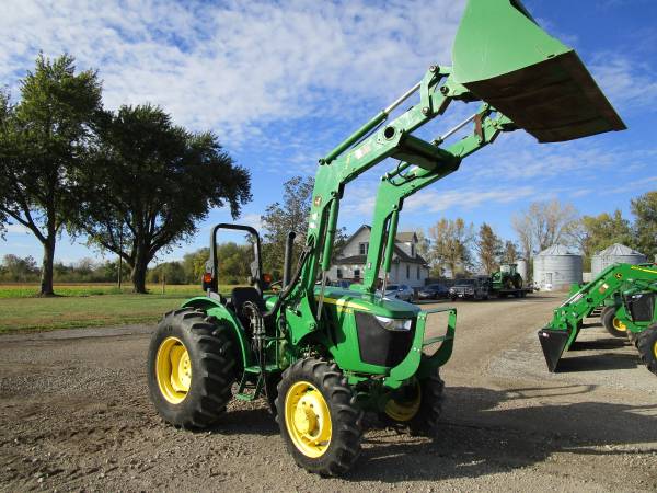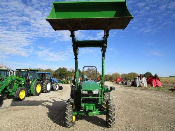 2015 John Deere 5055E tractor, 4wd, only 472 actual hours, 55 horsepower, 12 speed transmission w/ LH power reverser, 3 point hitch, 1 rear hydraulic remote, 540 & 540E pto, folding ROPS, diff lock, tool box, grill guard, original Goodyear tires, rear 16.9x28 @95%, front 9.5x24 @85%. Comes with a John Deere H240 loader with joystick, mid valve and 6' HD global quick attach bucket. No DEF. Good tractor, runs and works great. $28,500. Trades welcome. Financing and delivery available. Lots of tractors and equipment at bnttractor.com