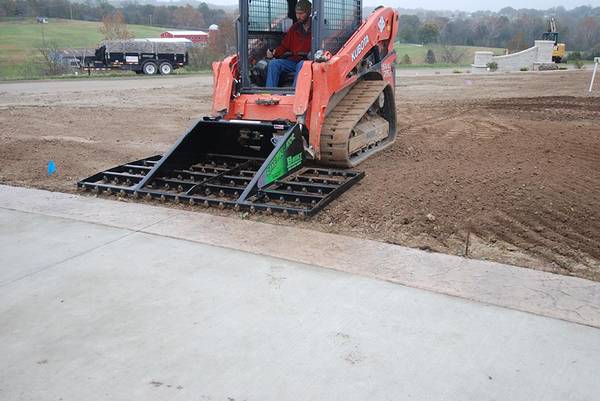 The patented Rake-N-Ator uses no moving parts that might slow you down. The teeth are, however, removable for easy replacement as they wear. The universal “quick-attach” mounting plate will fit any skid steer including, but not limited to, Gehl, New Holland, Bobcat, Kubota, and John Deere.