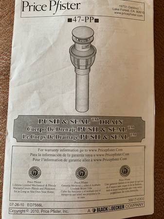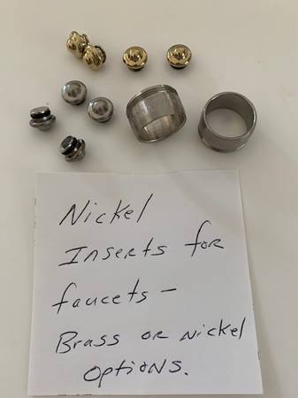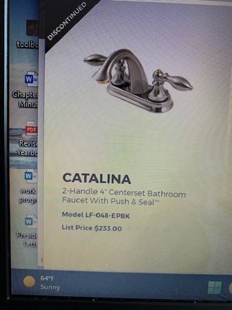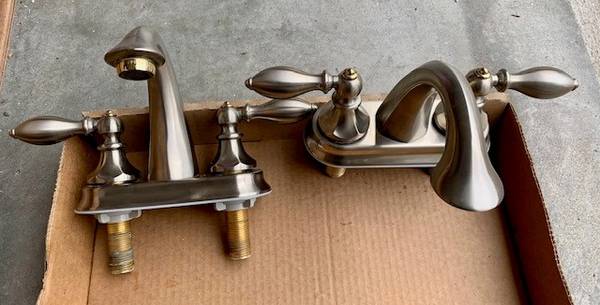 Have 2 Pfister Catalina 4 inch centerset 2-handle bathroom faucets in brushed nickel with brushed nickel or polished brass interchangeable handle tip insert (brass shown in picture). Includes push and seal drain and installation instructions. Asking $25 each or both for $40.