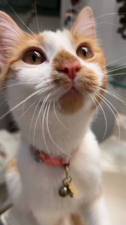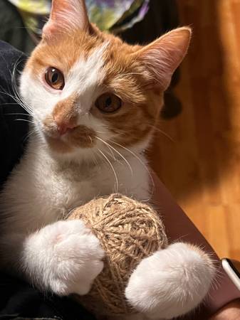 Female orange and white kitten Playful, loving, may take a day or two to get used to you. $10 rehome fee