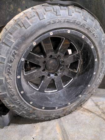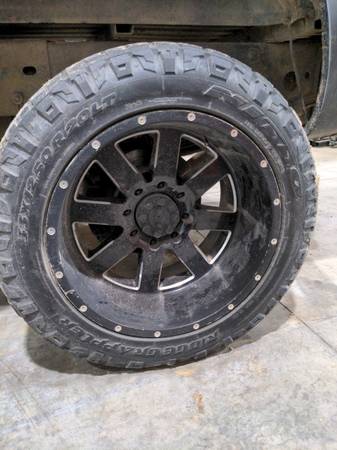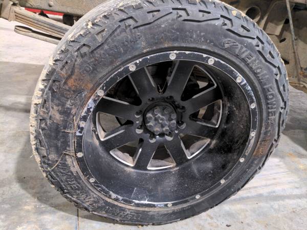 Selling set of 3 20" wheels that appear to be Moto Metal MO962 wheels. They are 8 lug and came off of 2005 chevy truck. Tires are included but need to be replaced. 4th wheel was busted in wreck....
