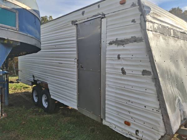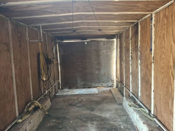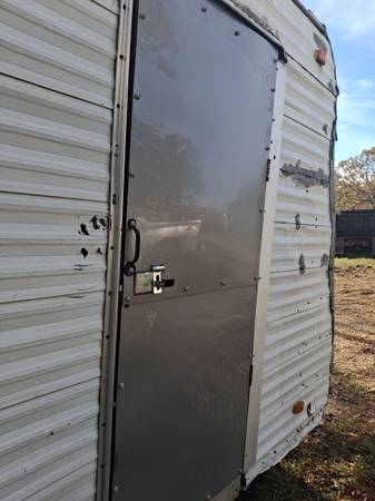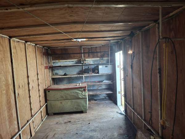 22x8 with 7' ceiling. Roof mount Solar panel with charger and deep cycle battery powers the winch operated rear ramp door. Lockable man door on the side not pretty but functional and heavy duty.